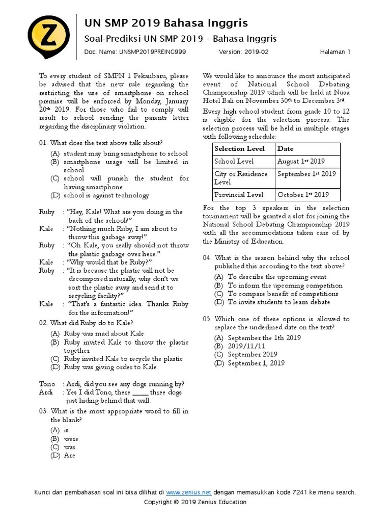Detik detik un smp 2020 1set lengkap ( bhs inggris, bhs indonesia, matematika, ipa). Contoh soal un bahasa inggris smp dan pembahasannya secara efektif. Untuk tujuan itulah maka kami bagi naskah soal ujian nasional (un) tahun lalu. Dibawah ini adalah prediksi soal un bahasa inggris smp beserta kunci jawaban. Soal un/unbk bahasa inggris smp/mts yang kami bagikan kali ini merupakan soal un bahasa inggris tahun 2017 yang sudah dilengkapi dengan .